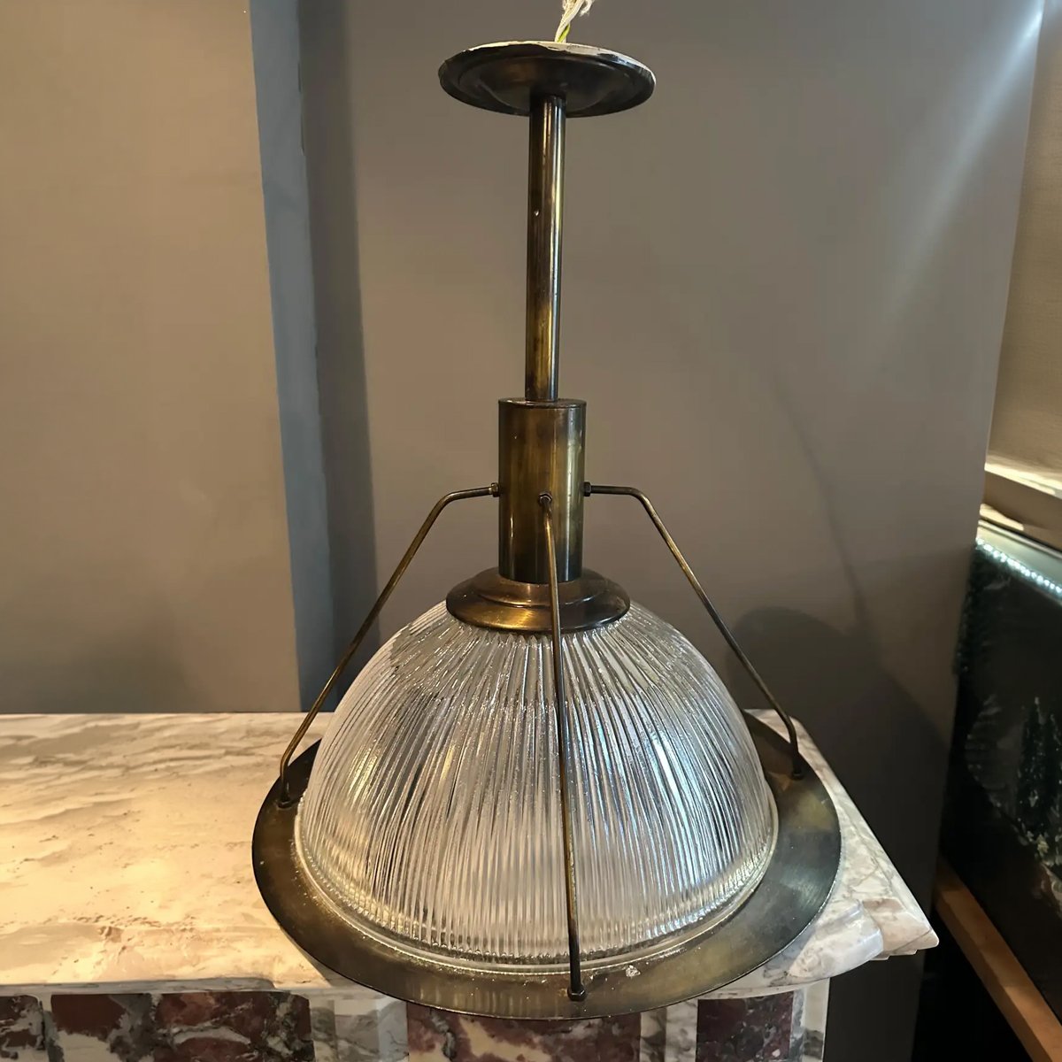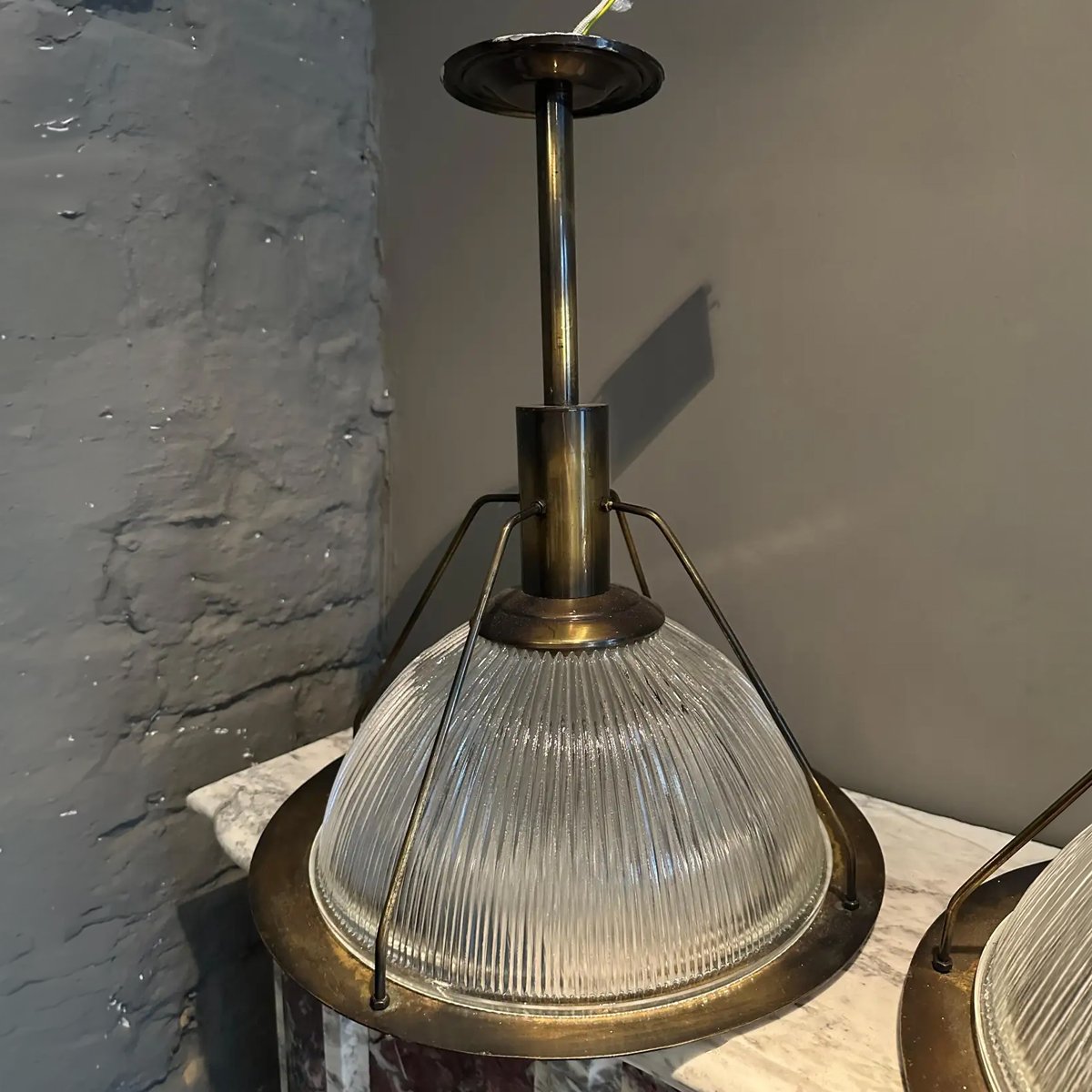 A set of three reclaimed Holophane style pendants. The ribbed dome glass shades withing a burnished and patinated brass frame. Single light fitting each. English late 20th c