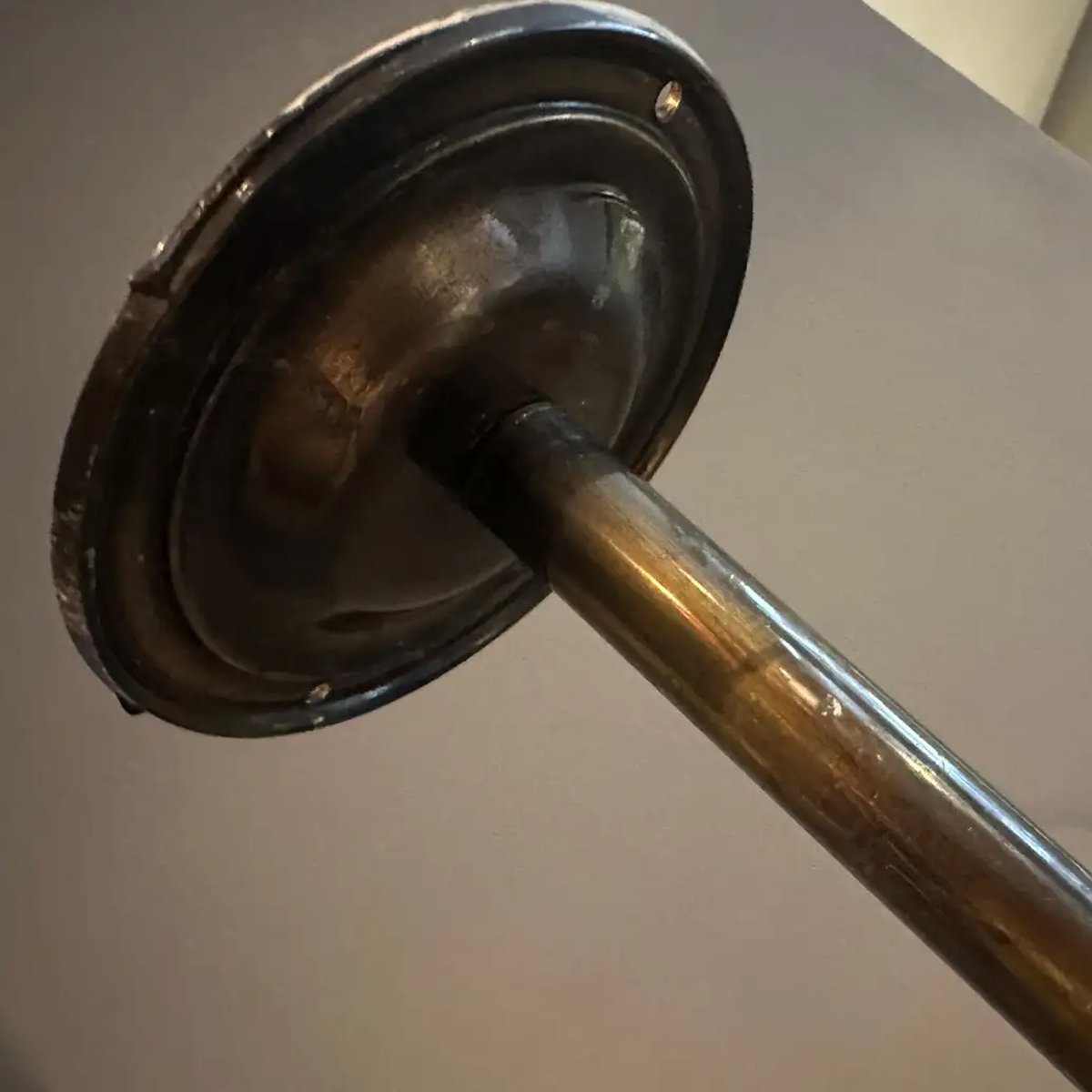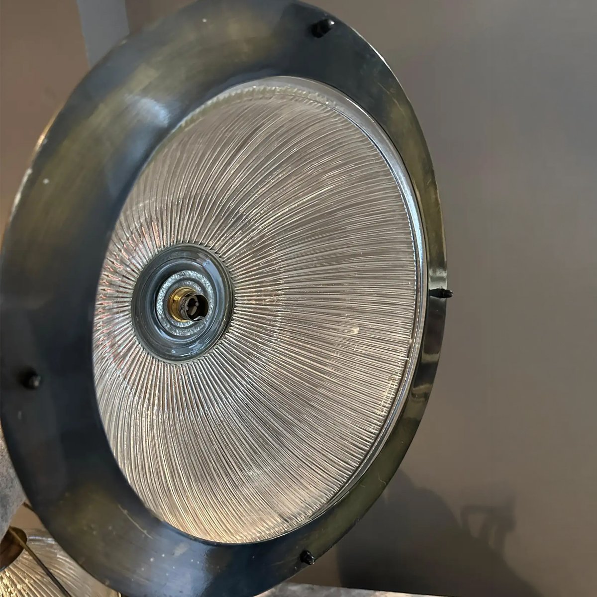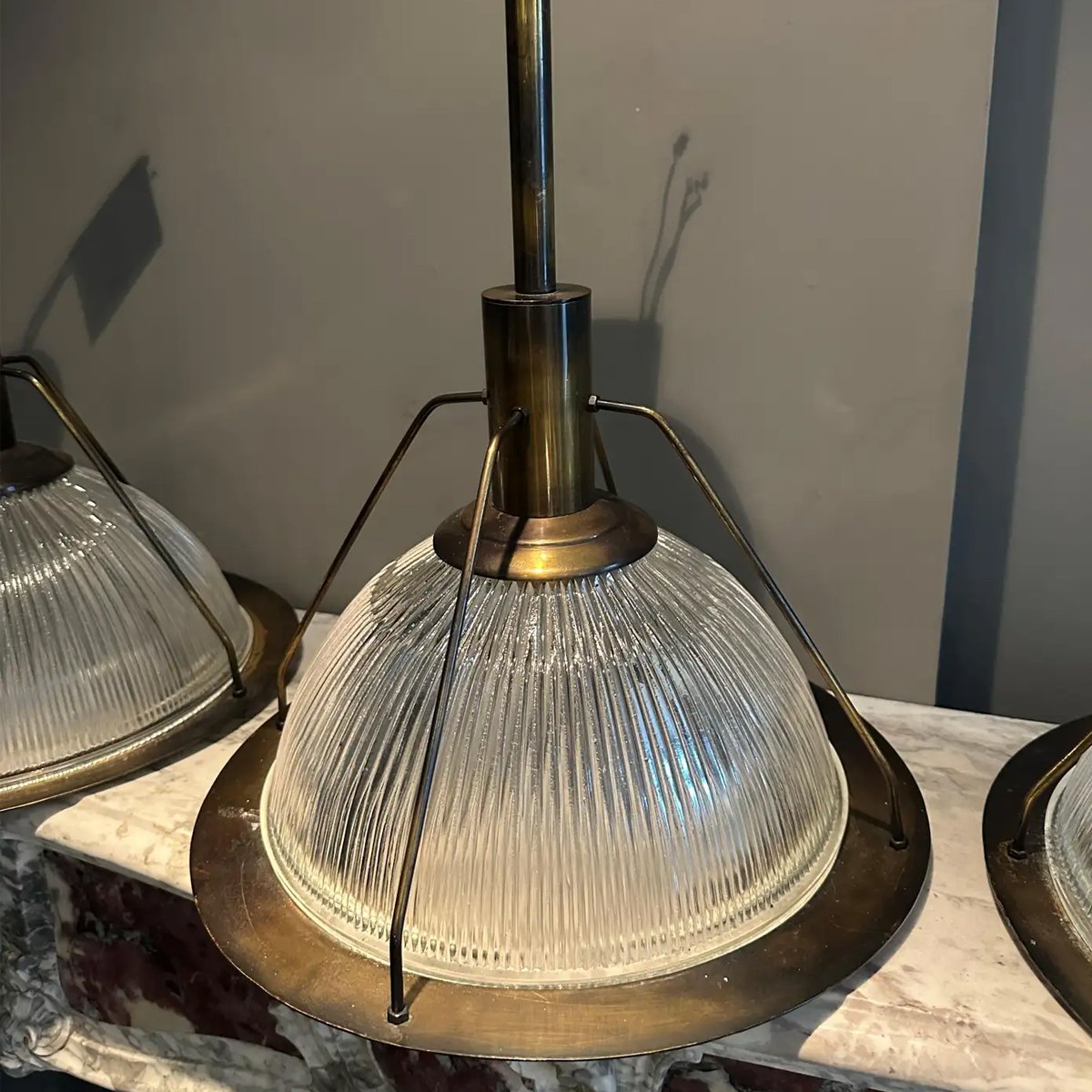 A Set Of Three Industrial Style Burnished Brass and Holophane Glass Pendants