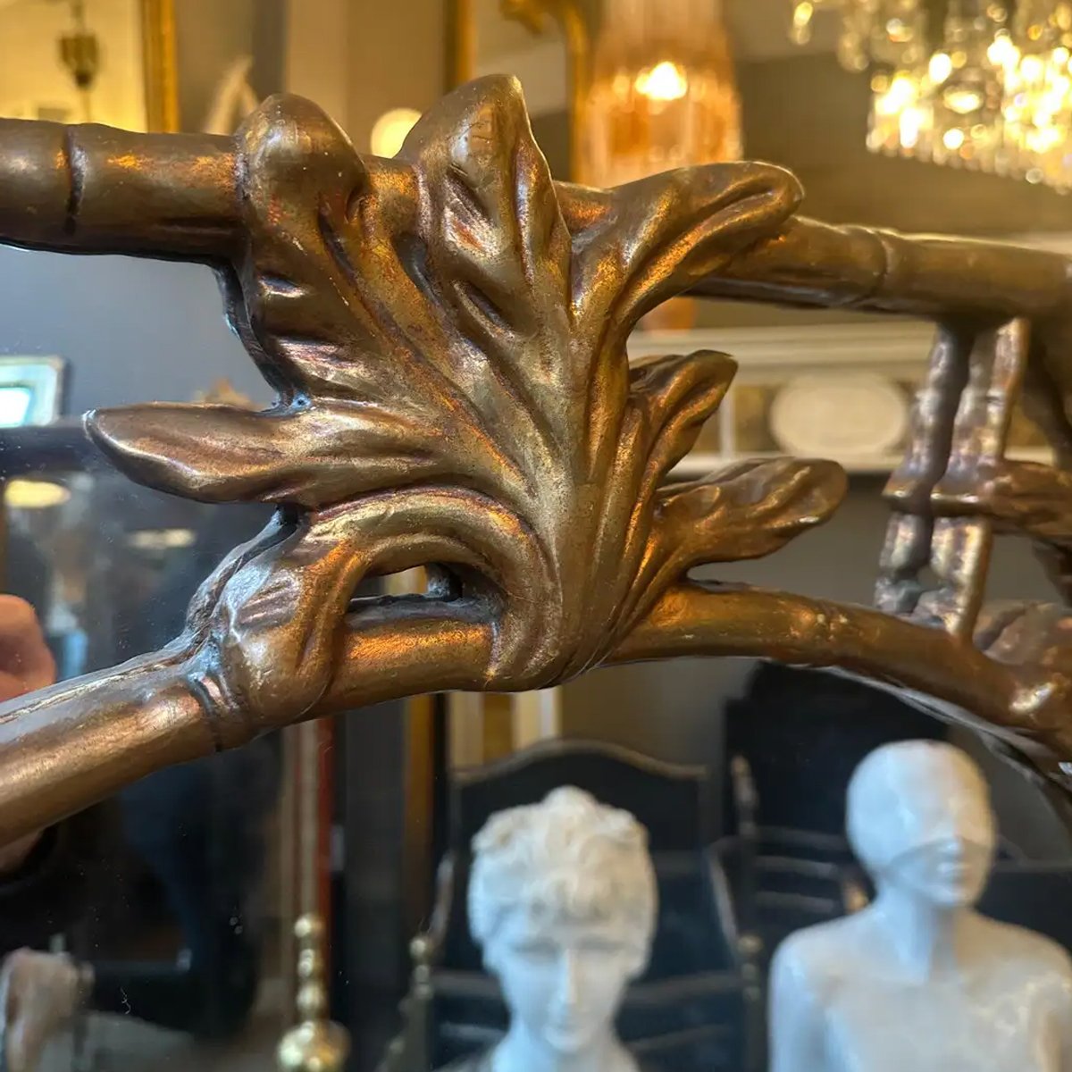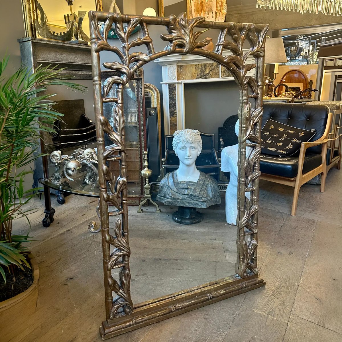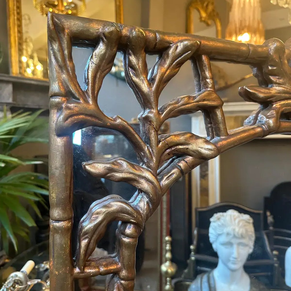 A French Gold gilt carved faux bamboo and foliate mirror, early to mid 20 century French taste of the time. Pretty clear plate, raised on a stepped plinth base. The frame of intertwined foliate and bamboo. Warm and worn gold gilt patina.