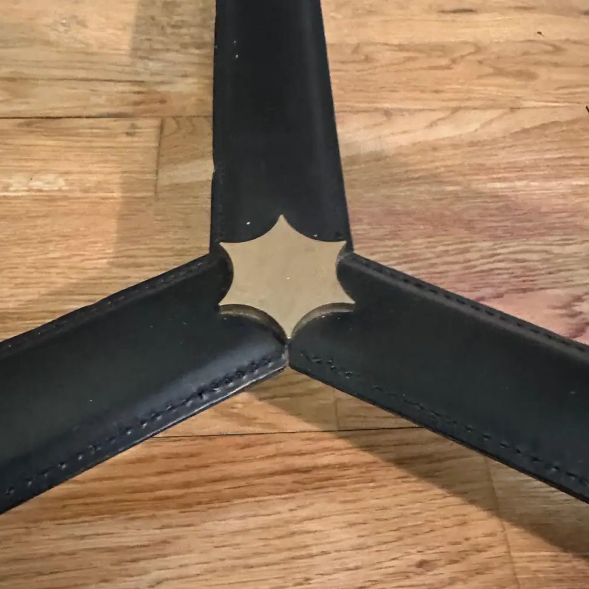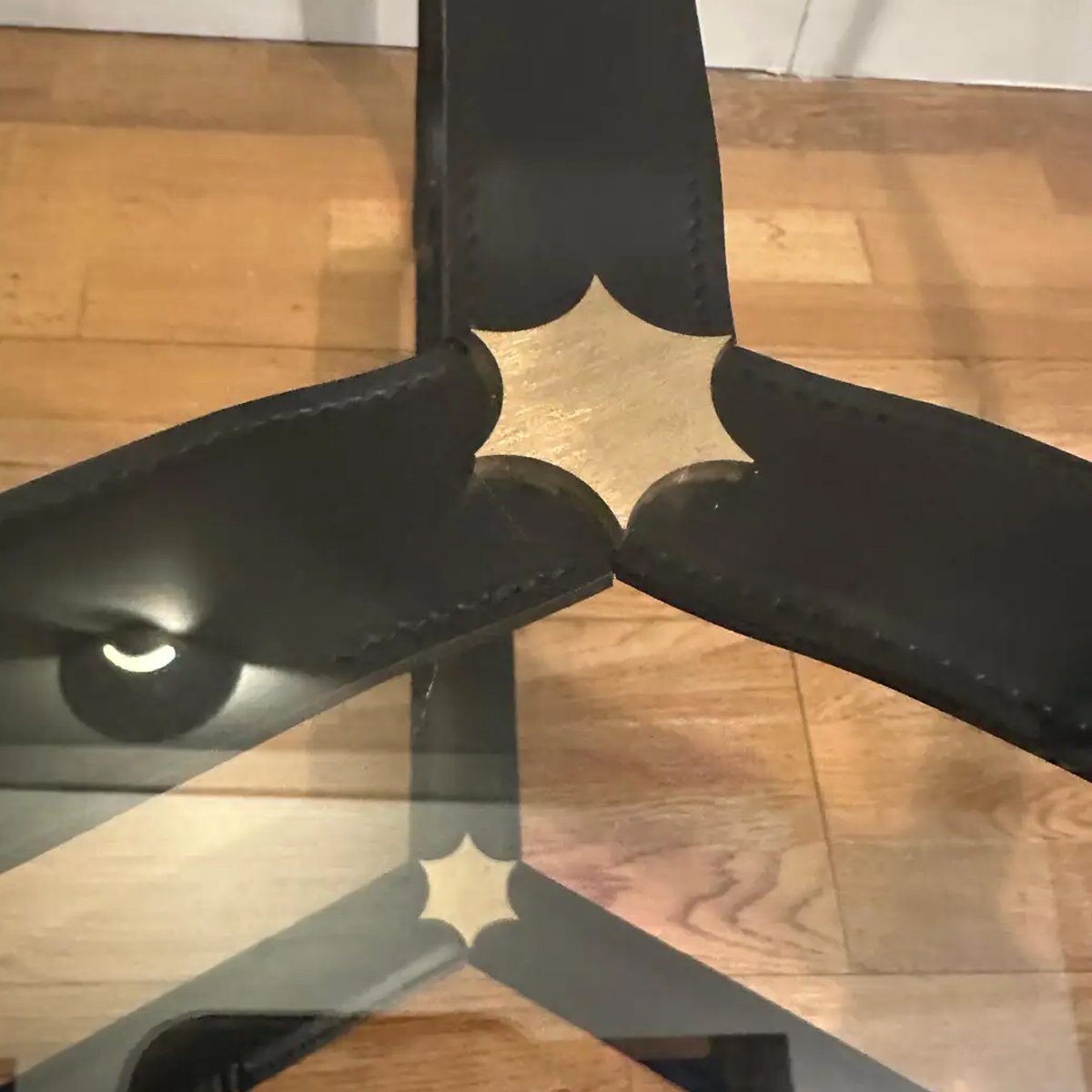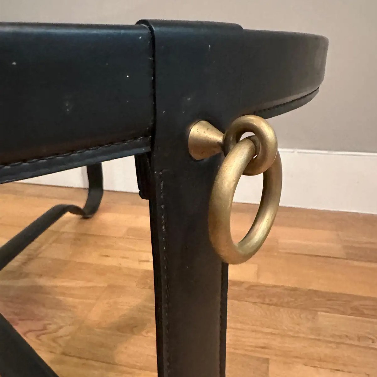 Circulaire Coffee table in stitched black leather, brass accents and thin glass top.