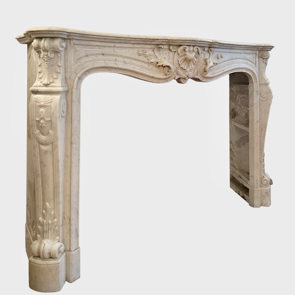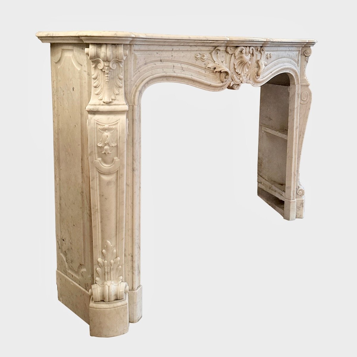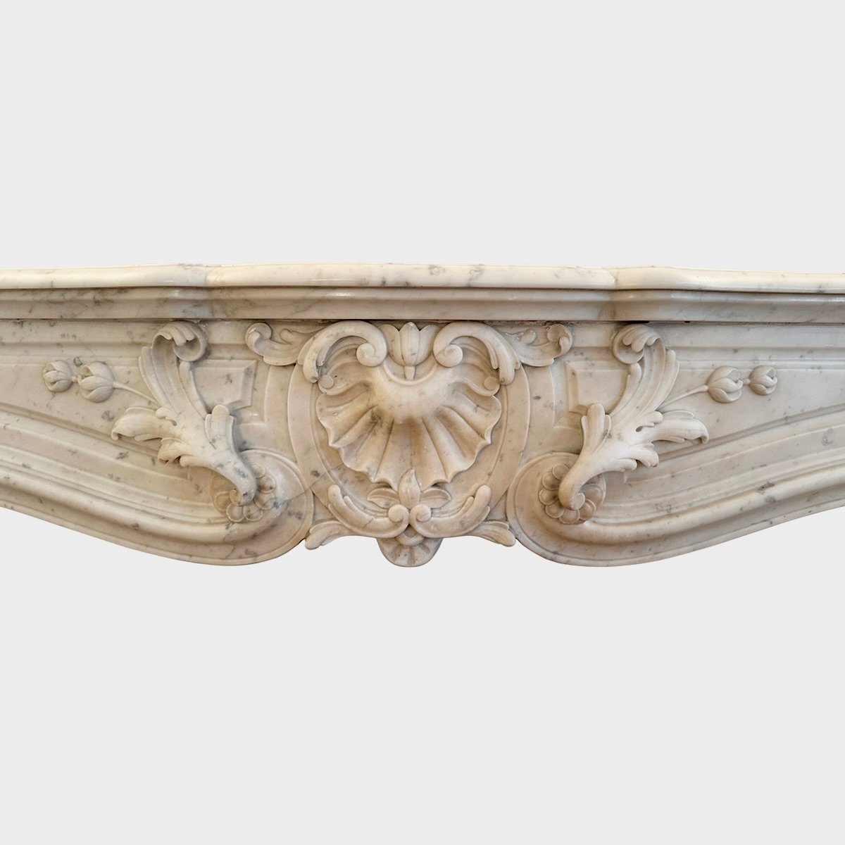 A large and very well carved Louis XV style fireplace in Italian Carrara Marble. The wide deep serpentine shelf with Rococo frieze beneath of carved central cartouche of shell and acanthus leaf with C scrolls, fielded panels either side.