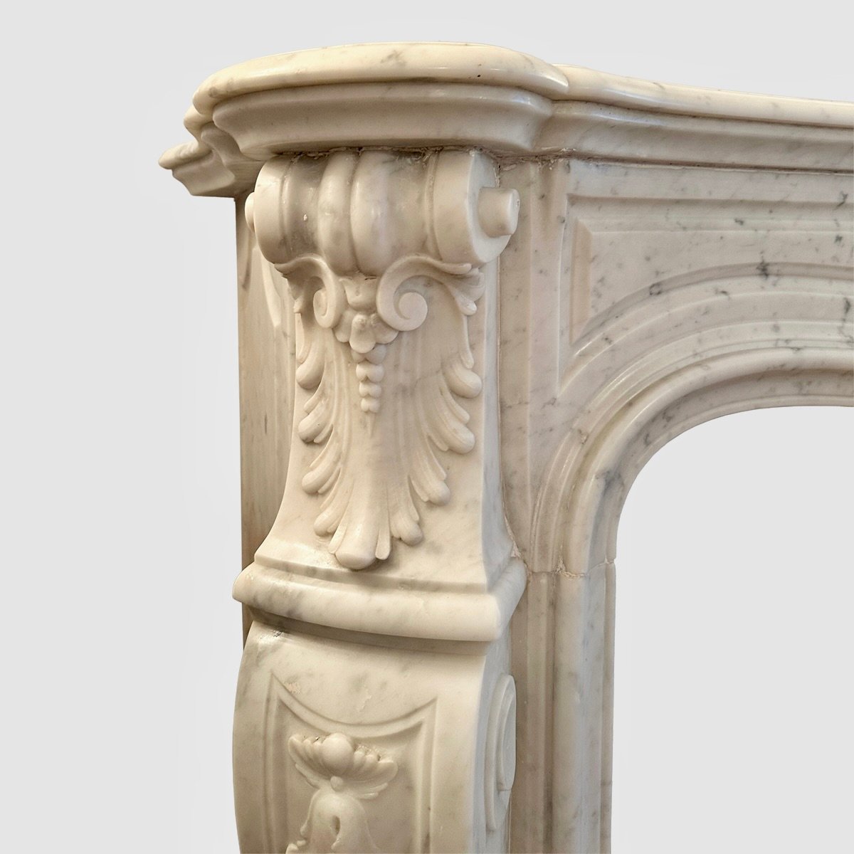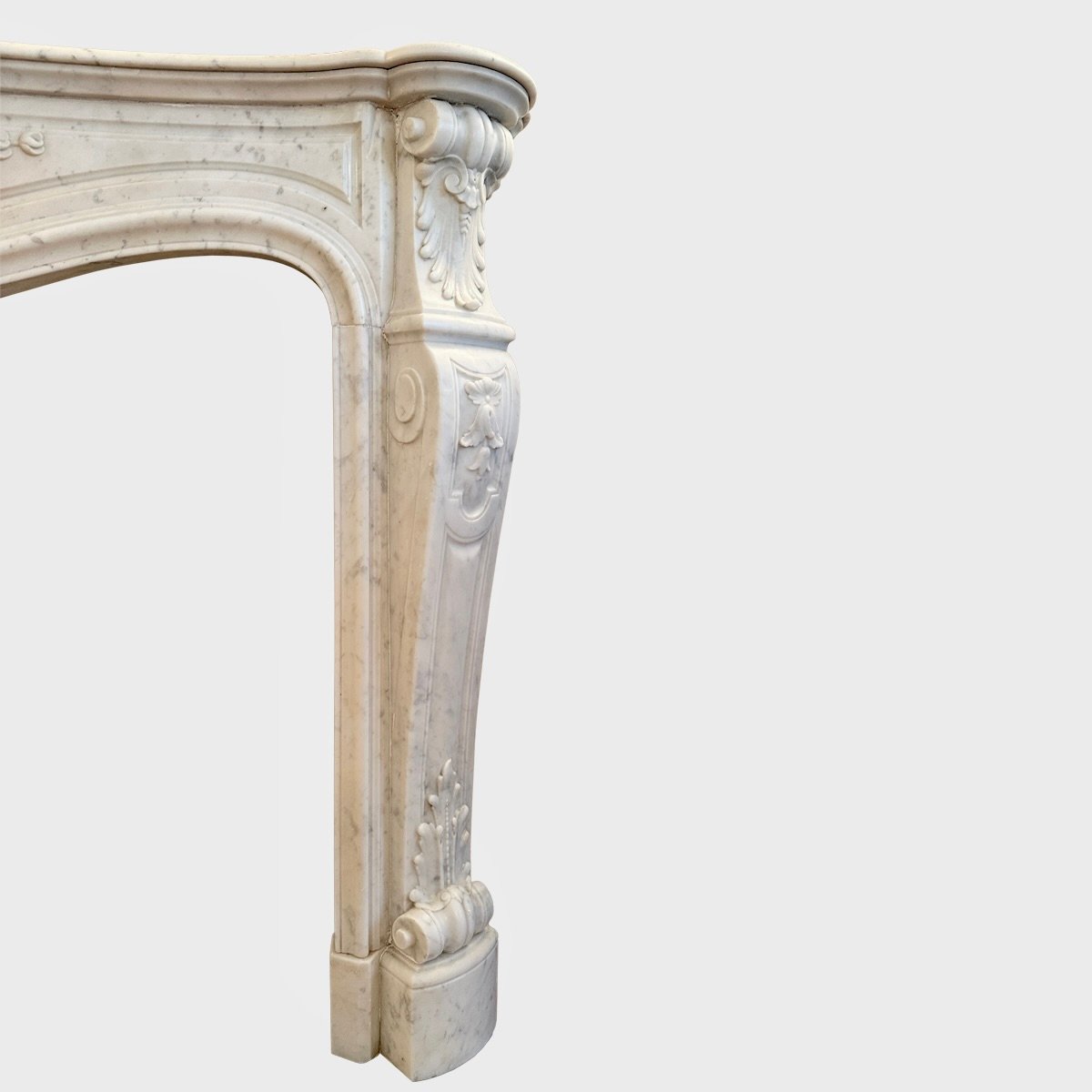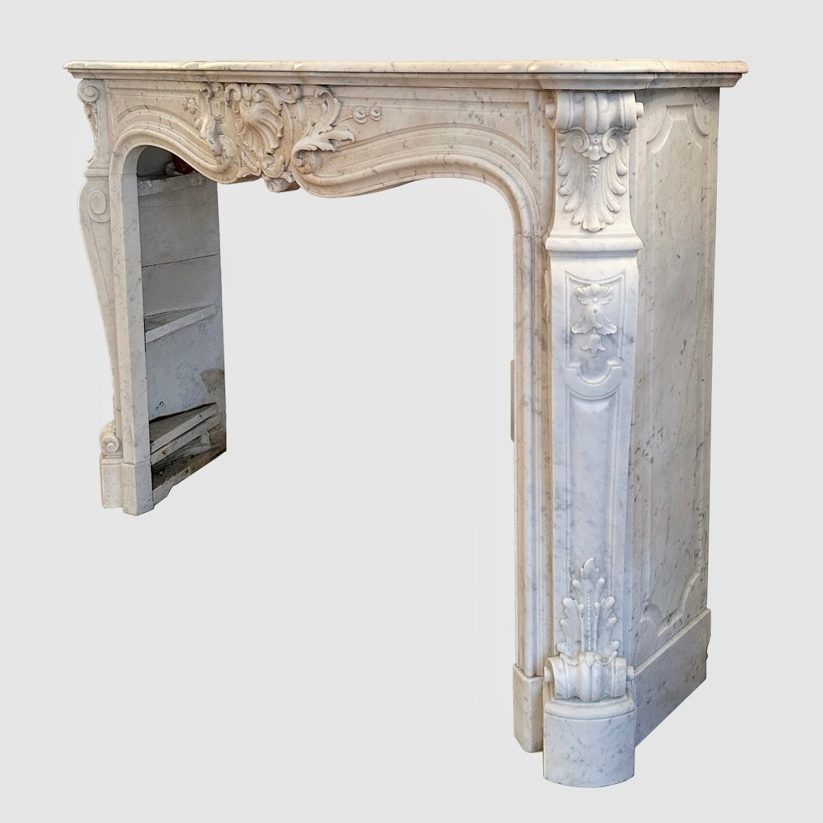 A large and very well carved Louis XV style fireplace in Italian Carrara Marble. The wide deep serpentine shelf with Rococo frieze beneath of carved central cartouche of shell and acanthus leaf with C scrolls, fielded panels either side.