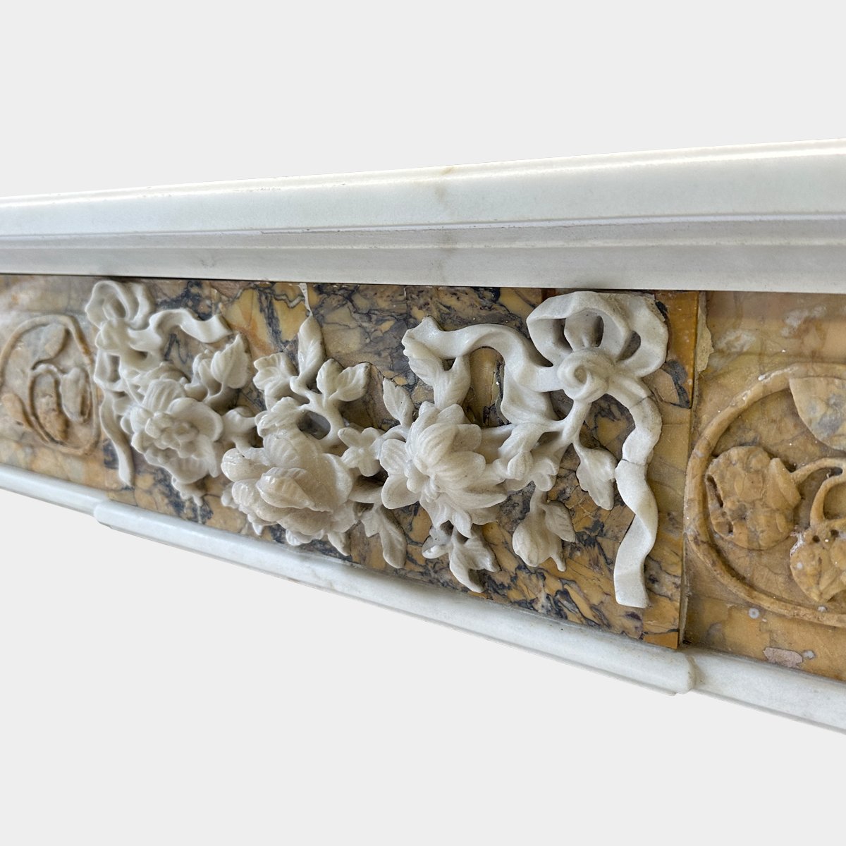 The frieze with centre tablet in Siena with ribbon tied white marble flowers and foliage carved in high relief flanked on either side by conforming carved foliate arabesque again in Siena.