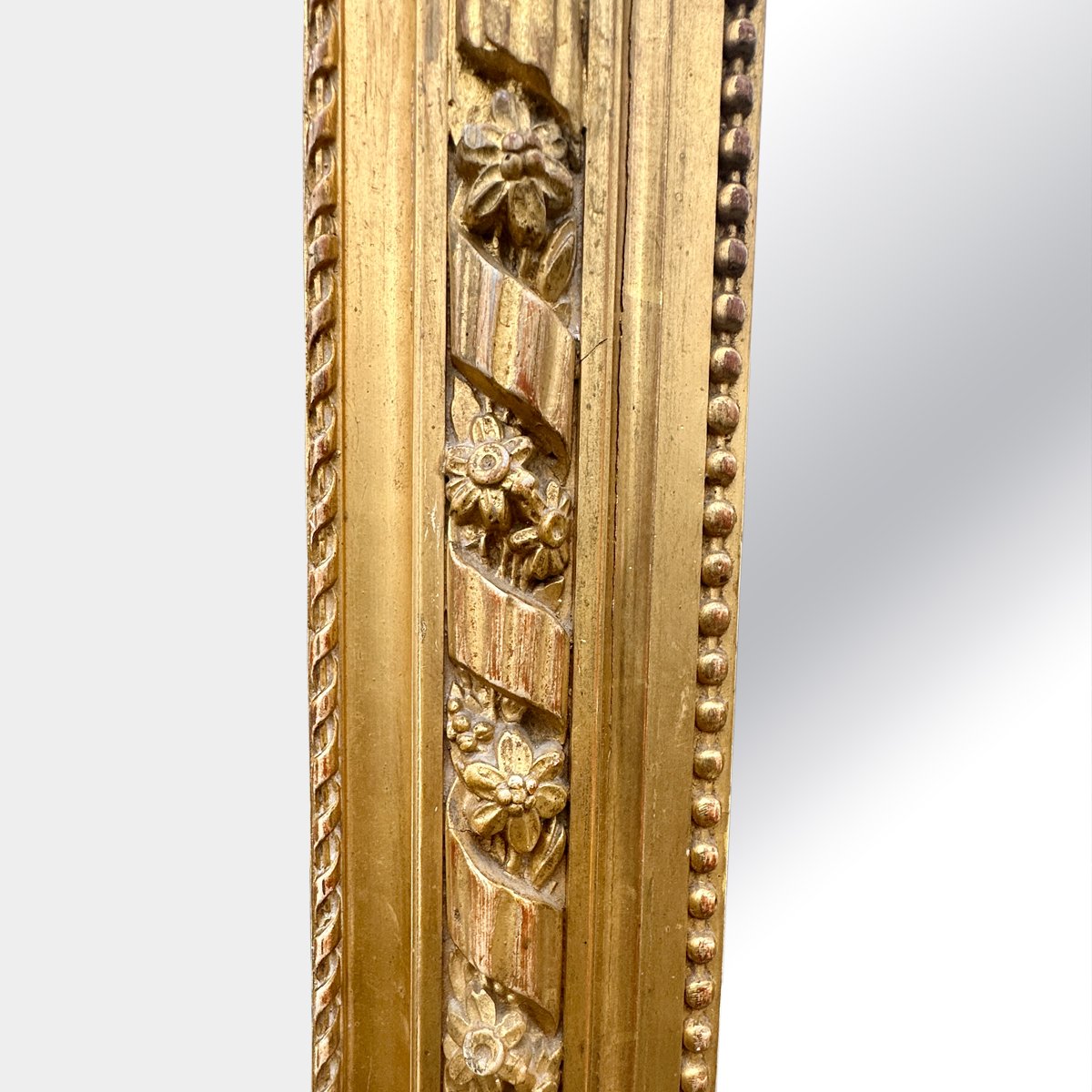 A huge antique French overmantle mirror in the Louis XVI manner. The frame decorated with ribbon twist and floral design, the inner slip beaded.